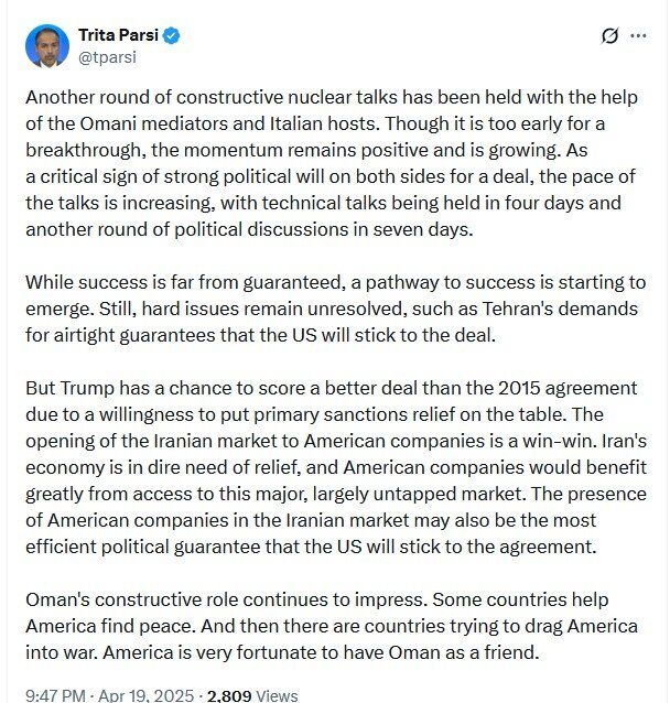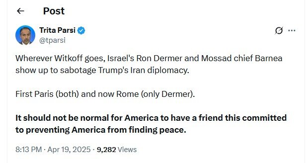 پارسی در توئیتی دیگر در واکنش به خبر حضور دو مقام اسرائیل در رم نوشت: هر جا که ویتکاف میرود، ران درمر اسرائیلی و بارنیا، رئیس موساد، ظاهر میشوند تا دیپلماسی ایران- ترامپ را خراب کنند.