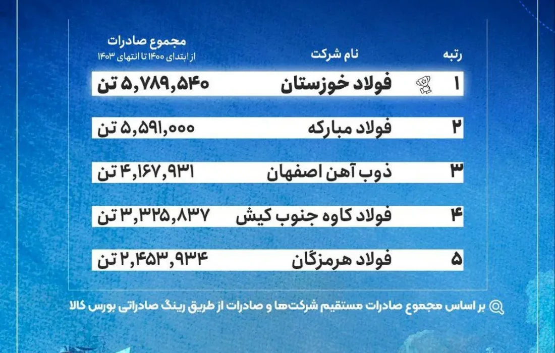به گزارش “هدف و اقتصاد” بعد از فولاد خوزستان در رتبه دوم این فهرست، فولاد مبارکه با صادرات ۵ میلیون و ۵۹۱ هزار تنی قرار دارد. ذوبآهن اصفهان نیز با صادرات بیش از ۴ میلیون و ۱۶۷ هزار تن رتبه سوم را از آن خود کرده؛ در حالی که شرکتهای فولاد کاوه جنوب کیش و فولاد هرمزگان به ترتیب با صادرات ۳ میلیون و ۳۲۵ هزار تن و ۲ میلیون و ۴۵۳ هزار تن در ردههای چهارم و پنجم این فهرست قرار دارند.